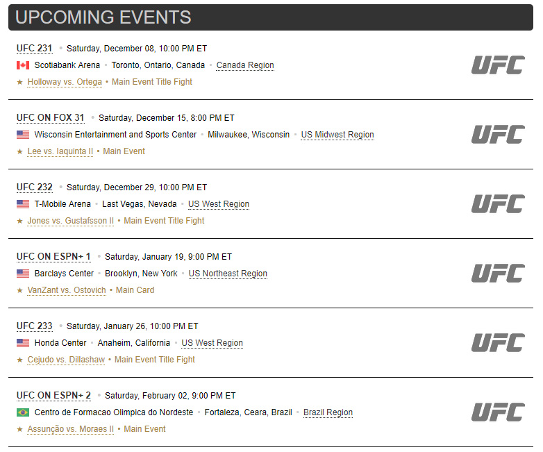 Just today I noticed that the UFC has officially changed the name of their Fight Night cards from “UFC Fight Night XXX” to “UFC on ESPN+ X”. This means that the majority of UFC cards WILL NOT be on TV in MOST major countries from January 2019 onwards.