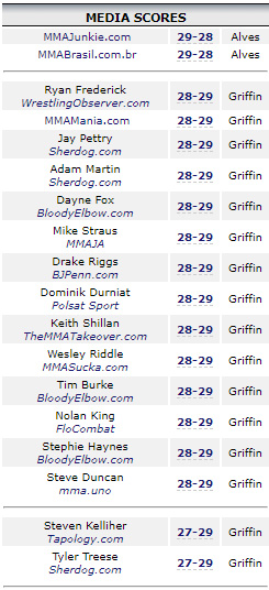There can be no doubt in anyone’s mind that Griffin won round 1 because he dropped Alves twice and came very close to a finish. I can understand why the judges gave round 3 to Alves under the new scoring criteria, but by using the new scoring, if you give round 3 to Alves you have to then give Griffin a 10-8 1st round. The new MMA scoring criteria which ALL MMA JUDGES should be using for EVERY EVENT clearly states when a round should be scored 10-8, and I feel that the damage that Griffin did in round 1 more than justifies a 10-8 round: